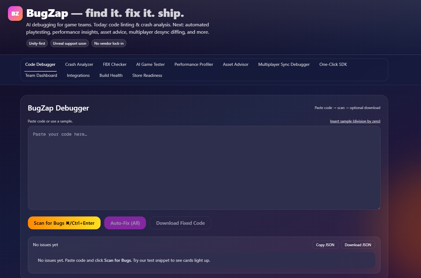 BugZap is the AI-powered crash analyzer that transforms chaotic error logs into clear, actionable insights. Built specifically for game developers, it identifies root causes instantly and helps you ship with confidence.
